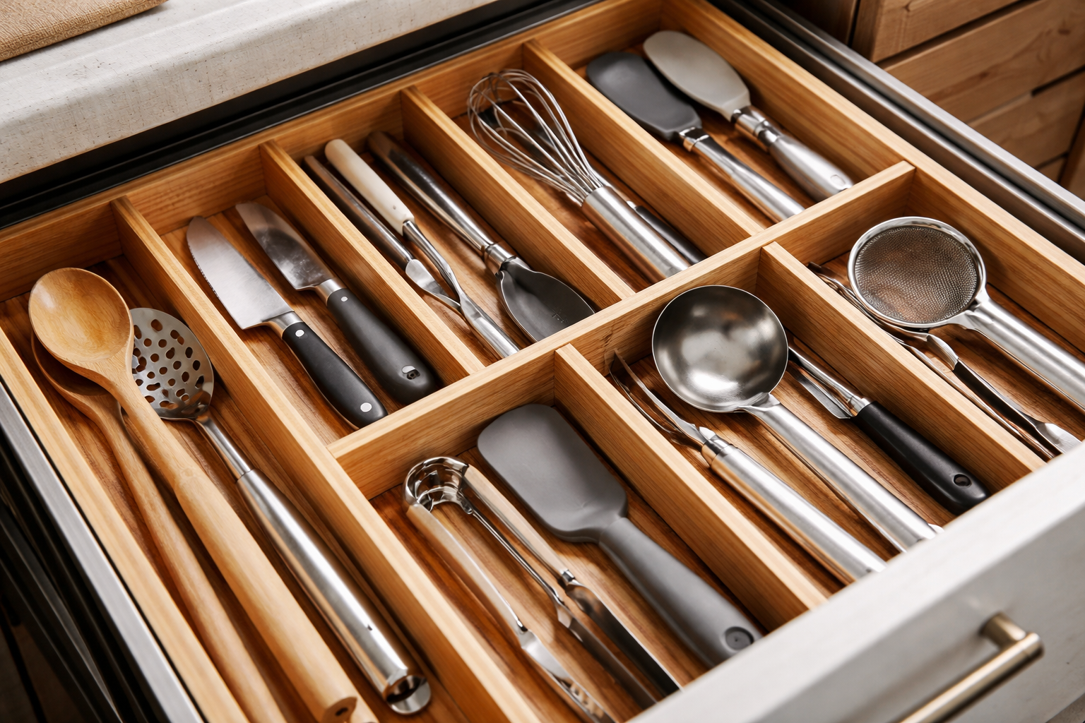 Gomila kutlača, metlica i noževa u ladici jako smeta i gubi dragocjeno vrijeme na kuhanje. Godinama sam organizirao prostor u kuhinji i znam kako brzo riješiti ovaj problem: sada ću podijeliti provjerena rješenja koja će vam pomoći da jednom zauvijek stvorite savršeni red.