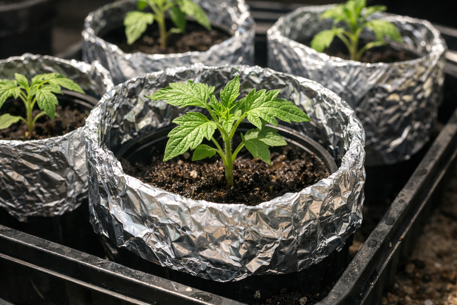 Moj osobni dokazani životni trik protiv pregrijavanja korijena na prozorima okrenutim prema jugu je čvrsto omotavanje plastičnih čaša običnom folijom za hranu tako da je sjajna strana okrenuta prema van.