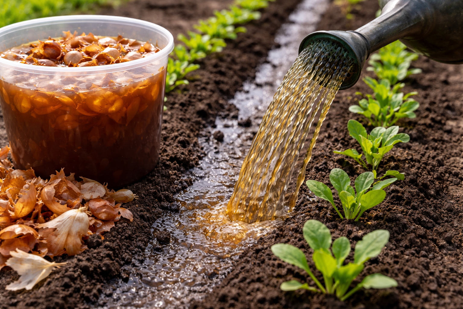 Suhe ljuske običnog luka sadrže snažan koktel korisnih elemenata. Ovdje se svira glavna violina fitoncidi – prirodni antibiotici koji suzbijaju rast patogene mikroflore. Zemlji je potrebno lagano buđenje nakon zime, a organsko zalijevanje to najbolje čini.