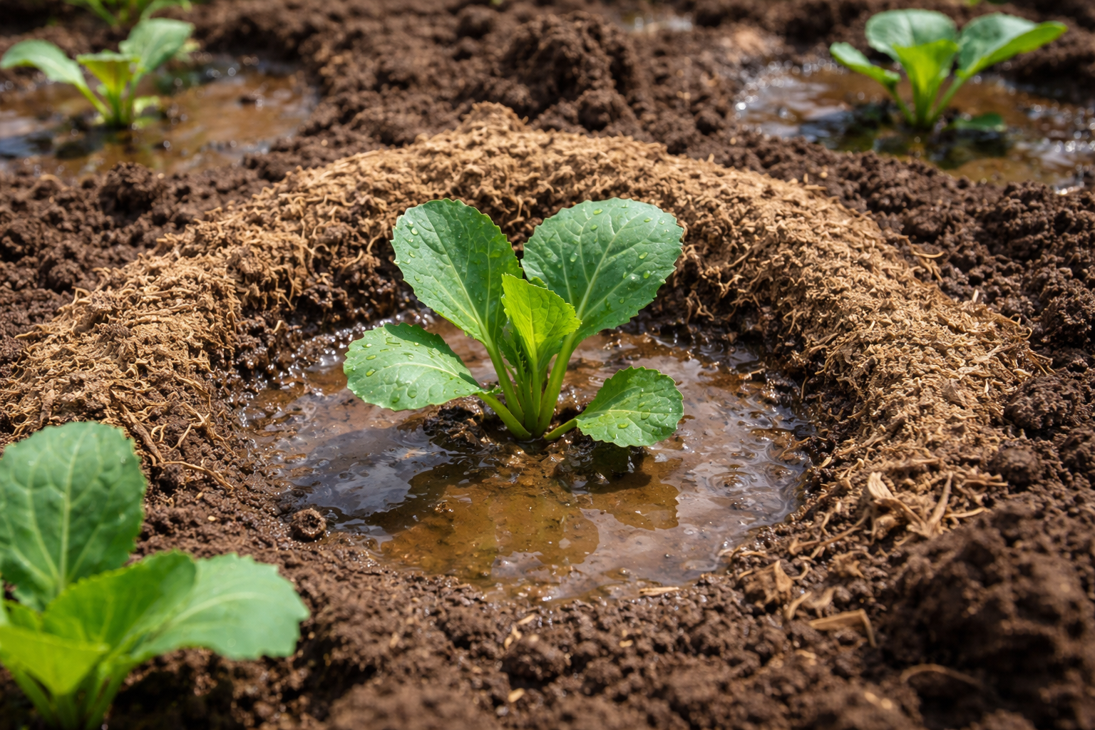 Glavna tajna brze prilagodbe je posaditi kupus izravno u tekuće blato, a rupu na vrhu obavezno malčirati labavim, suhim tlom kako biste spriječili stvaranje tvrde kore i blokirali isparavanje dragocjene vlage.