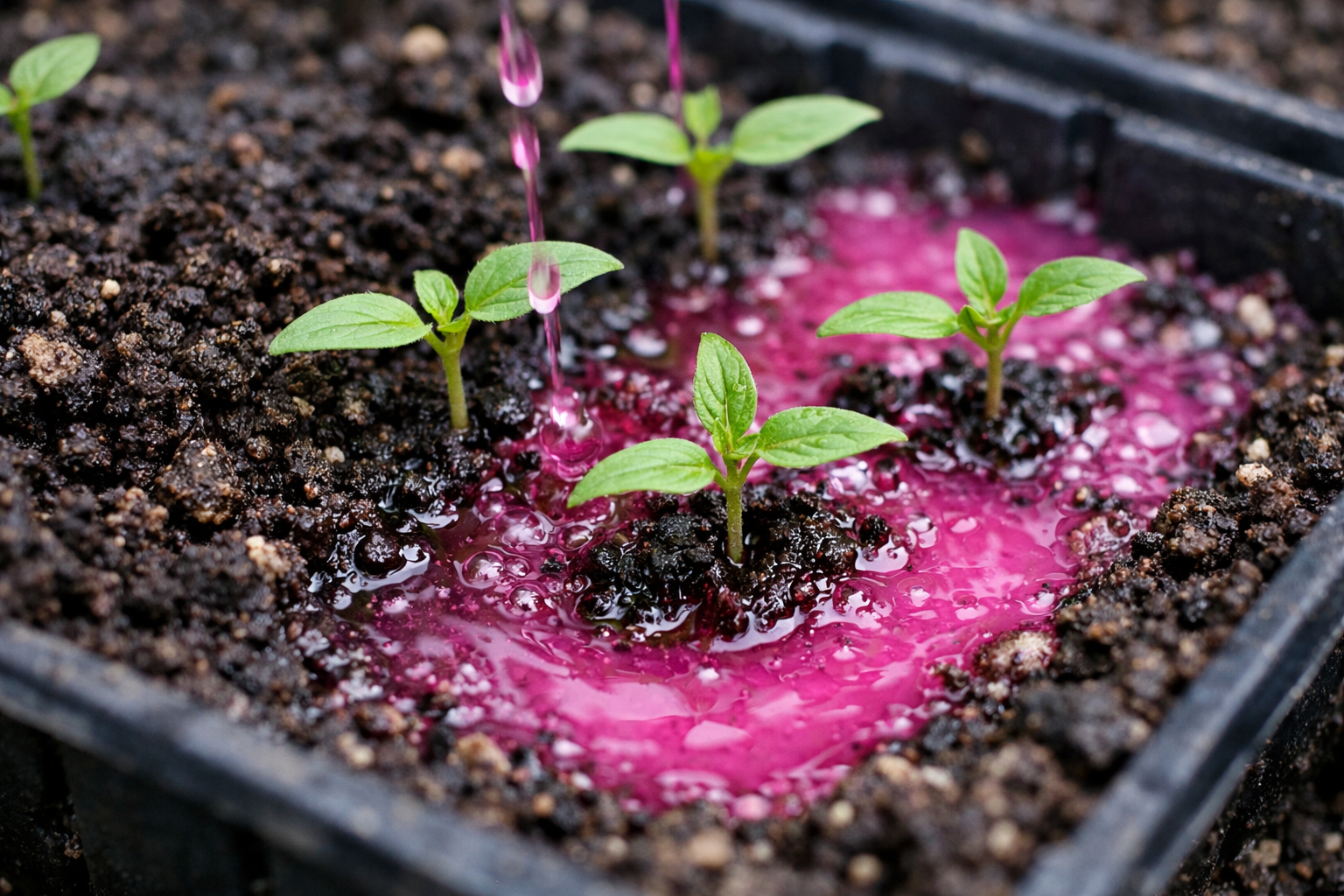 Nikada nemojte zalijevati koncentrirani kalijev permanganat na suho tlo, jer će to neizbježno dovesti do nepovratnih kemijskih opeklina korijenskih dlačica.