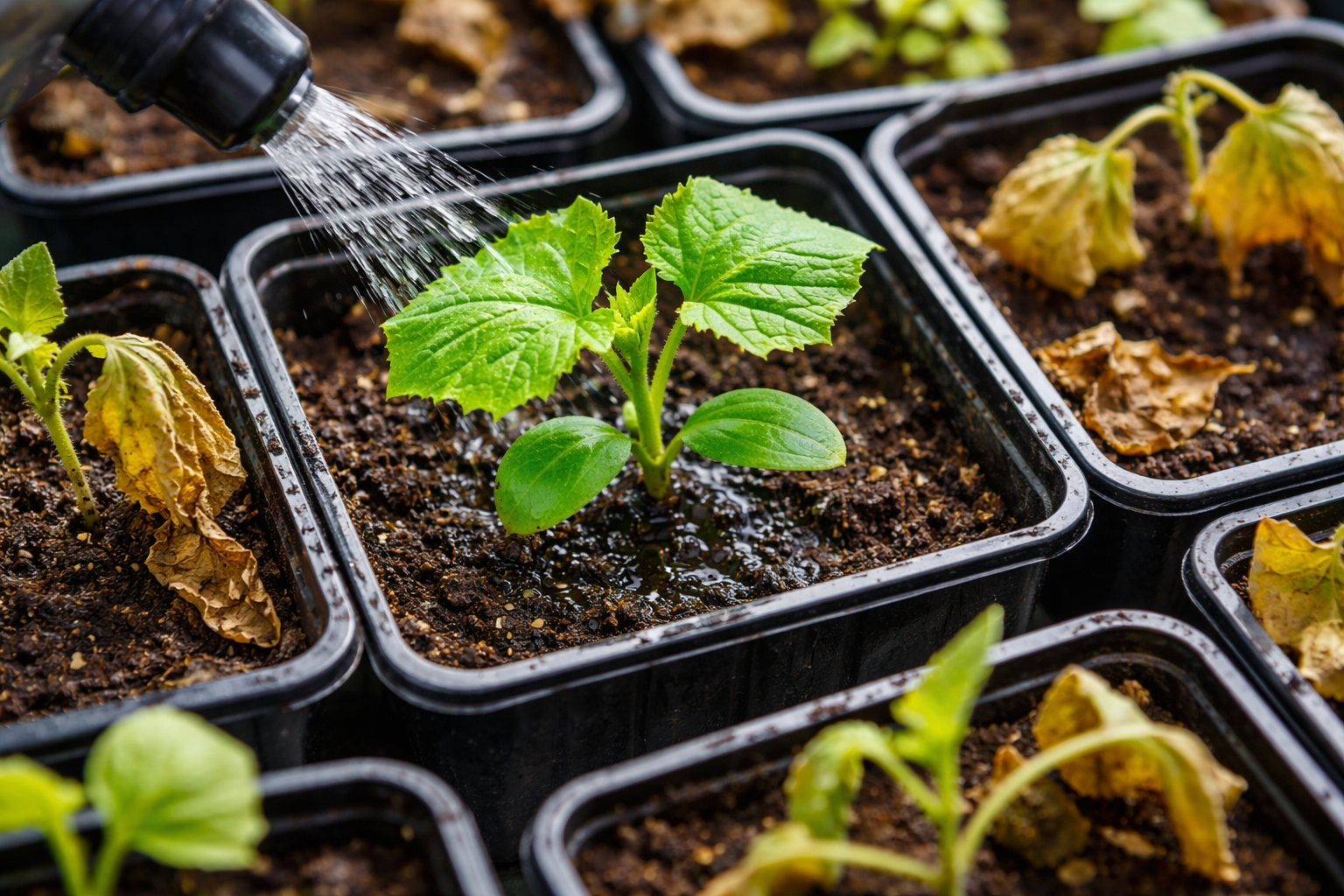 Pravilno zalijevanje je umjetnost koja zahtijeva strogu ravnotežu. Temperaturni stres ubija sadnice jednako brzo kao i suša. Voda uvijek treba biti topla.
